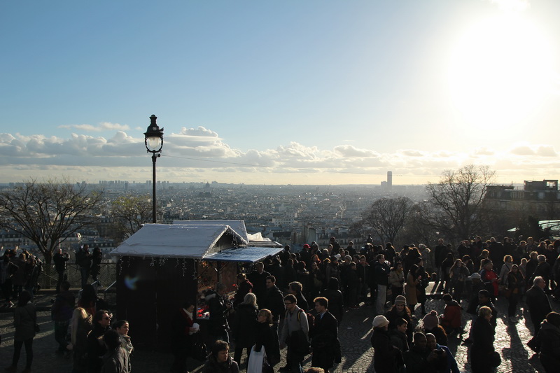 Paris, Montmartre. Vue sur Paris et le marché de Noël depuis le Parvis du Sacré-Cœur.