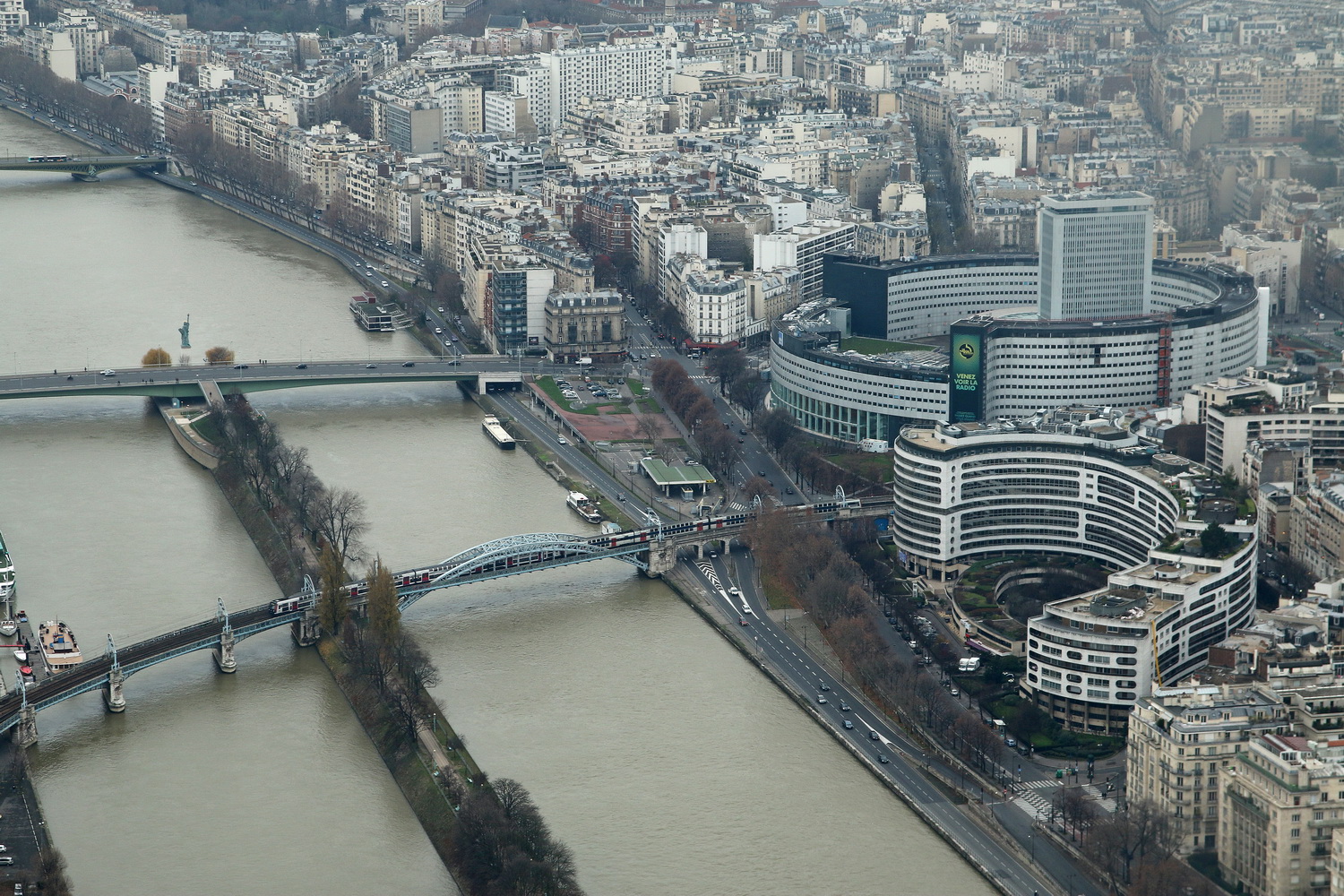 Vue sur la Seine et la Maison de la Radio depuis le 3ème étage de la Tour Eiffel.