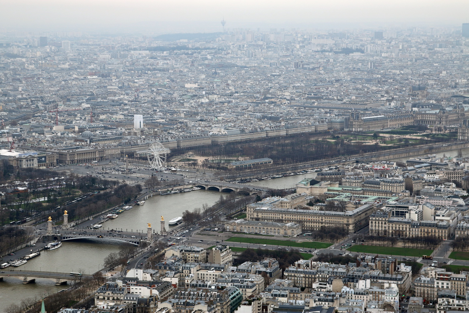 Vue sur le Grand Palais et la place de la Concorde depuis le 3ème étage de la Tour Eiffel.