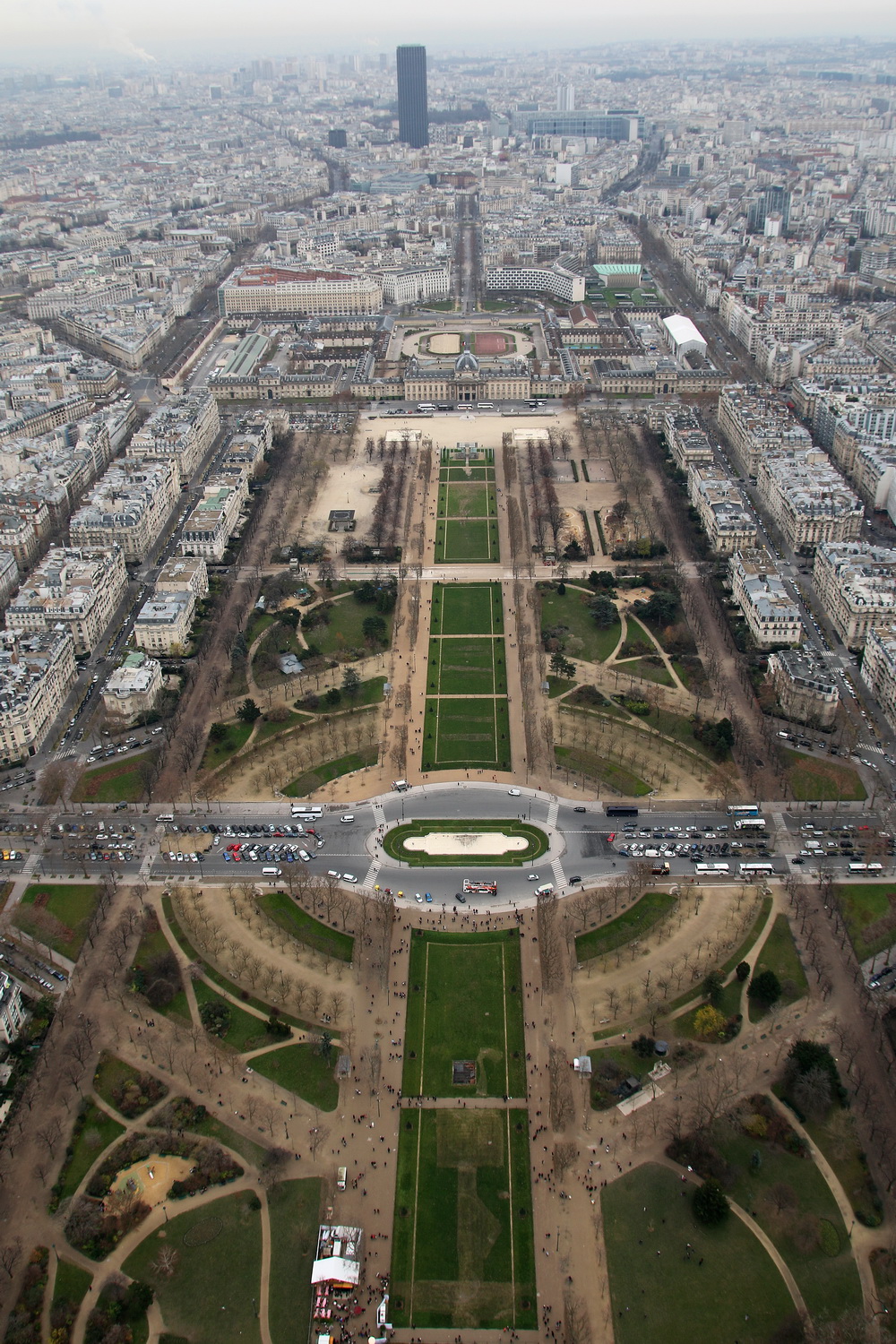 Vue sur le parc du Champ de Mars, l’école militaire et la Tour Montparnasse depuis le 3ème étage de la Tour Eiffel.