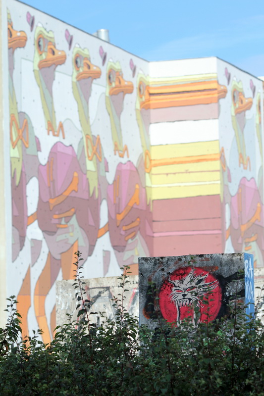 Certains graffs sont monumentaux et même commandés par les villes à des artistes reconnus. Après, on aime ou pas, mais au moins, il y a une idée. Le graff ci-dessous (les autruches) couvre la hauteur d’un immeuble. Comme je n’aime pas photographier l’œuvre de quelqu’un d’autre et, en quelque sorte, me l’accaparer en 1/200 s, je cherche à faire dialoguer l’œuvre avec son environnement, des gens, une autre création… Ici, j’ai trouvé amusant de mettre sur la même photo ces autruches aux abois et un prédateur monstrueux graffé sur un muret, caché derrière des buissons, comme s’il allait sauter sur les oiseaux pour les dévorer.