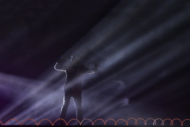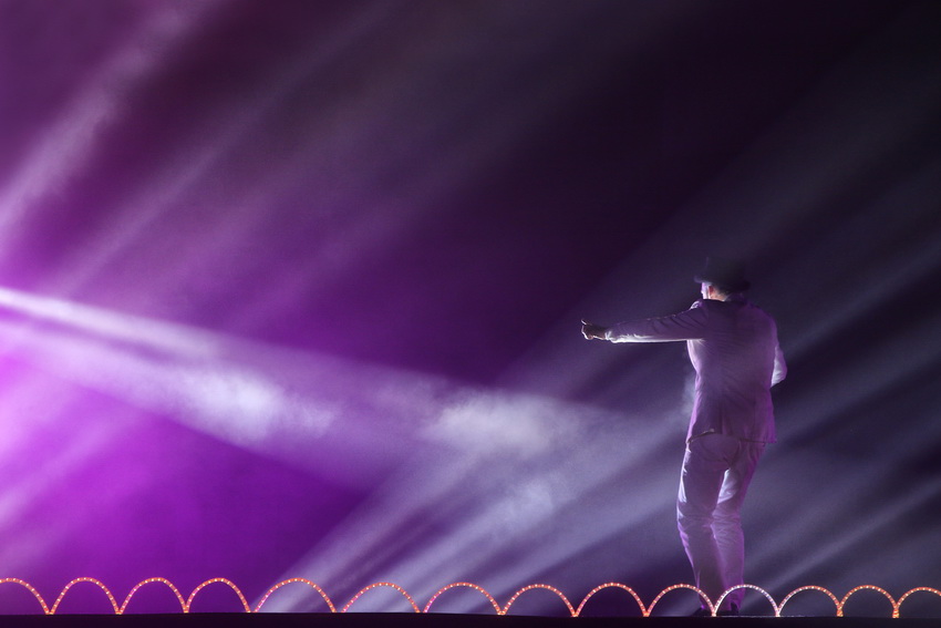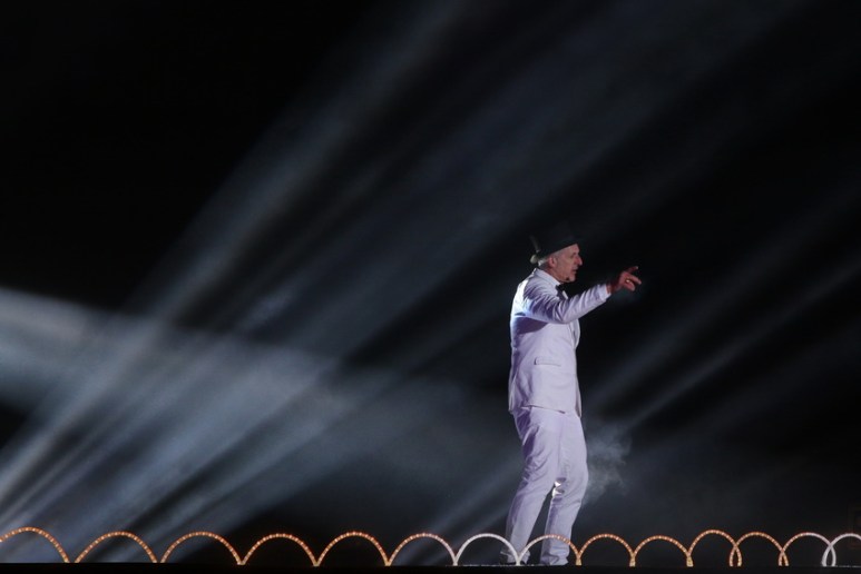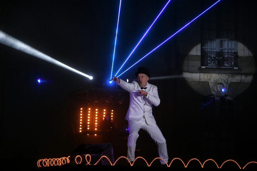 Soudain, le spectacle commence avec un drôle de personnage habillé en blanc et cerné par de multiples faisceaux lumineux.