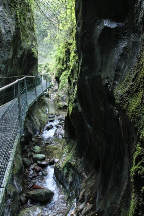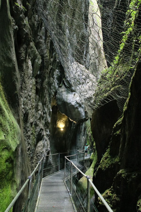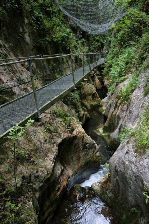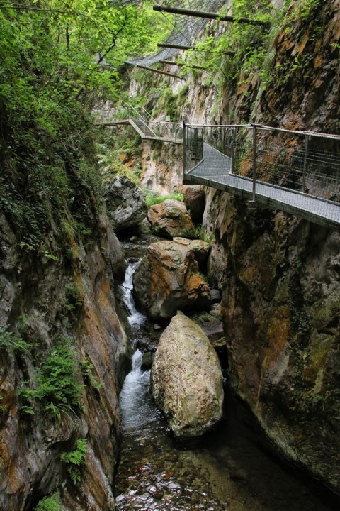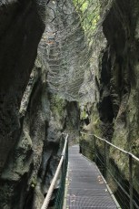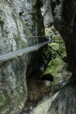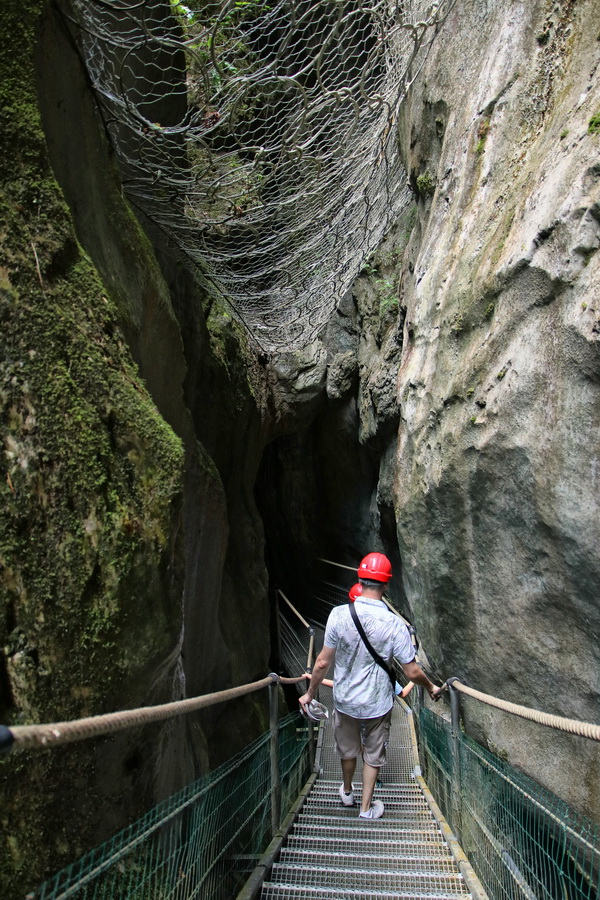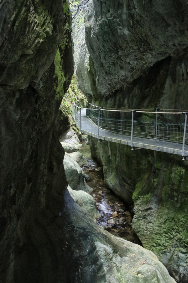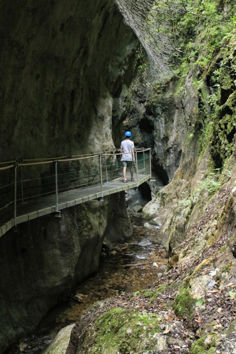 • A mon avis, le casque est plus destiné à protéger la tête contre les chutes de petits cailloux et pour le cas où l’on se cognerait contre la parois. C’est vrai que le filet de protection gâche un peu la vue mais il n’y a pas d’autres solutions pour parer aux chutes de rochers de taille moyenne. Quant à la passerelle, si elle n’existait pas, on n’aurait pas d’autre choix que d’entrer dans les gorges en mode canyoning, avec combinaison et harnais, pour ceux qui ont la condition physique…
