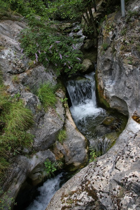 Une fois engagé dans les gorges, le chemin serpente au-dessus de la petite rivière qui continue de creuser la roche.