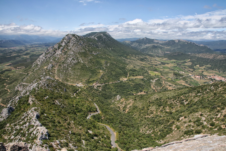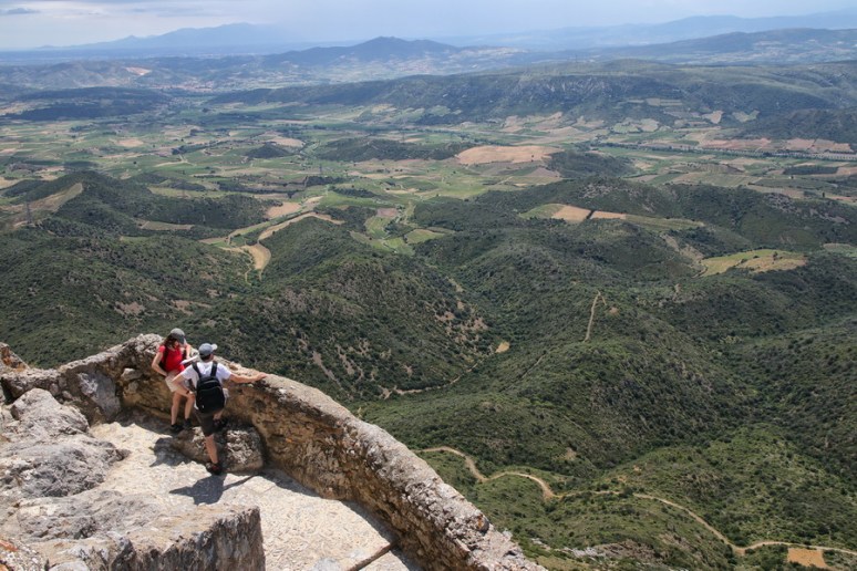 Vue sur la vallée depuis le donjon San Jordi du château de Peyrepertuse (Aude).