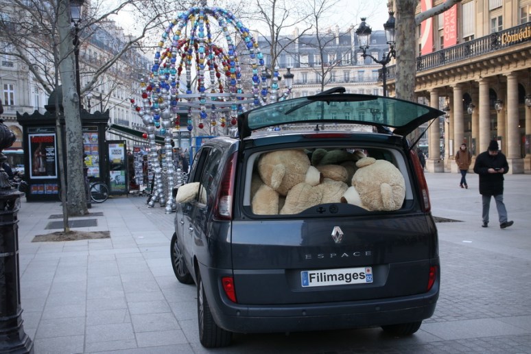 • Je croyais que le truc situé derrière la voiture était une déco de Noël ! Faut dire que c’était pendant les fêtes de fin d’année… 🙂 Du coup, il y avait du monde partout, surtout autour des colonnes de Buren. Impossible de faire les « mêmes » photos que toi.