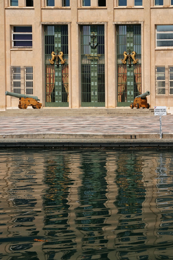 Toulon est une ville tournée vers la mer, avec ses ports militaires, de pêche et de plaisance, protégés par la rade et la presqu’île de Saint-Mandrier-sur-Mer. Le port militaire ne se visite évidemment pas et le port « civil » est d’une rare mocheté pour une ville de ce rang. La faute à une immense barre d’immeuble qui borde le port et à une tour tout aussi laide qui fait office de mairie. Malgré tout, l’ambiance estivale de port animé avec commerces et restaurants est bien présente pour nous faire (presque) oublier cette catastrophe architecturale. À la limite entre le port de plaisance et le port militaire, la préfecture maritime relève un peu l’ensemble.