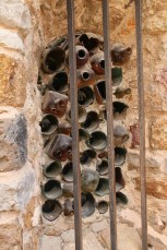 La chapelle a été restaurée à partir de 1956 par un moine qui, visiblement, avait peu de moyens mais des idées. La particularité du vitrail est… qu’il a été réalisé avec des fonds de bouteilles de toutes les couleurs ! Voici l’envers du décor vu depuis l’extérieur (cliquer pour mieux voir) :