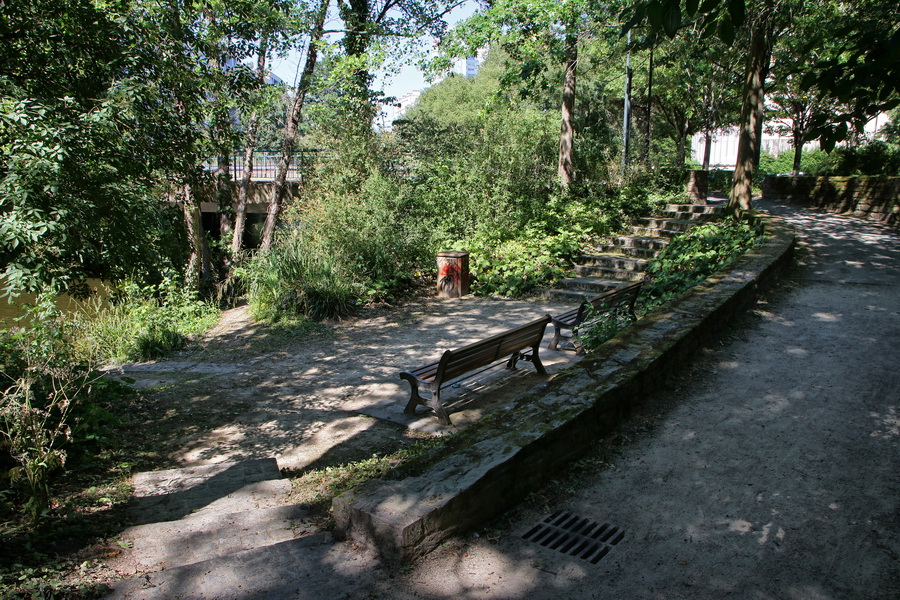 La promenade du Lavoir se termine (ou commence, si on marche dans l’autre sens) sur ce petit square. Cette fois-ci, il n’y a pas de passage sous le pont. Il faut gagner le trottoir et traverser la rue de Brest pour continuer.