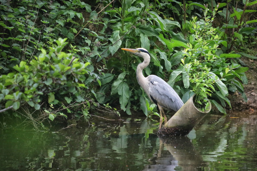Le héron est posé sur un ancien tuyau que le temps a transformé en pot de fleur. Il y a beaucoup de poissons à cet endroit, ce qui témoigne d’une bonne qualité de l’eau.