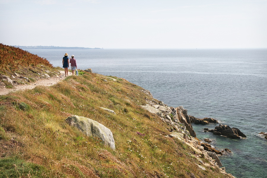 Le GR34 offre de jolies vues sur l’océan et les îles. Vers le Sud, on aperçoit au loin le phare de Kermorvan. Rappelez-vous… le phare le plus à l’Ouest de la France continentale. 🙂