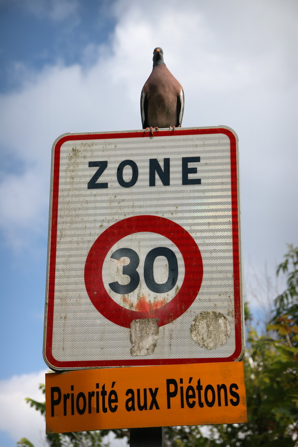 Le dernier panneau m’a amusée. » Zone à 30 et priorité aux piétion »s. Parce que pour faire 30 km à l’heure, faut déjà être costaud. LOL!