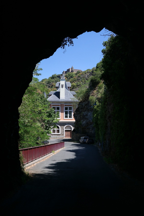 Pour accéder à la presqu’île, on passe dans un tunnel. La maison rose que l’on voit au fond est une… centrale hydroélectrique EDF. Au-dessus, on aperçoit le prieuré.
