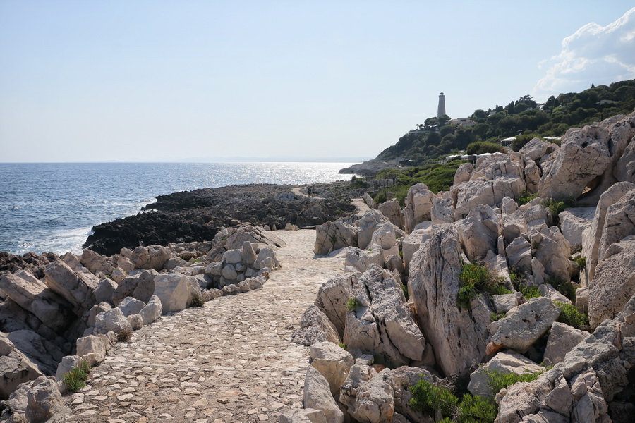A mi-chemin de la promenade, à l’extrémité sud de la presqu’île, le phare du Cap Ferrat est en vue.