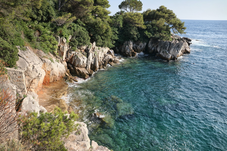 Continuons à marcher sur le sentier littoral en direction du Sud. Peu avant le port de Saint-Jean-Cap-Ferrat, on arrive à la plage Cros Dei Pin.