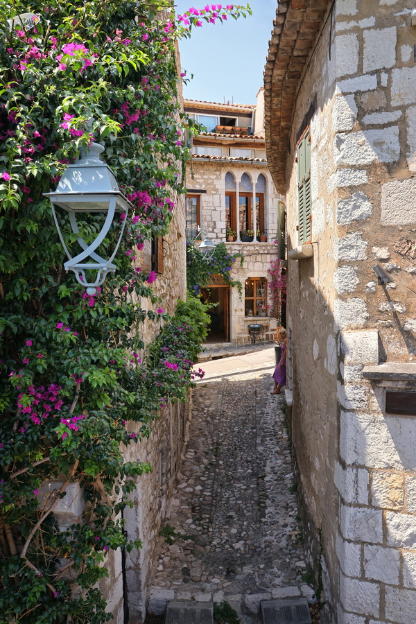 Ruelle étroite à Saint-Paul-de-Vence, dans les Alpes-Maritimes (France).