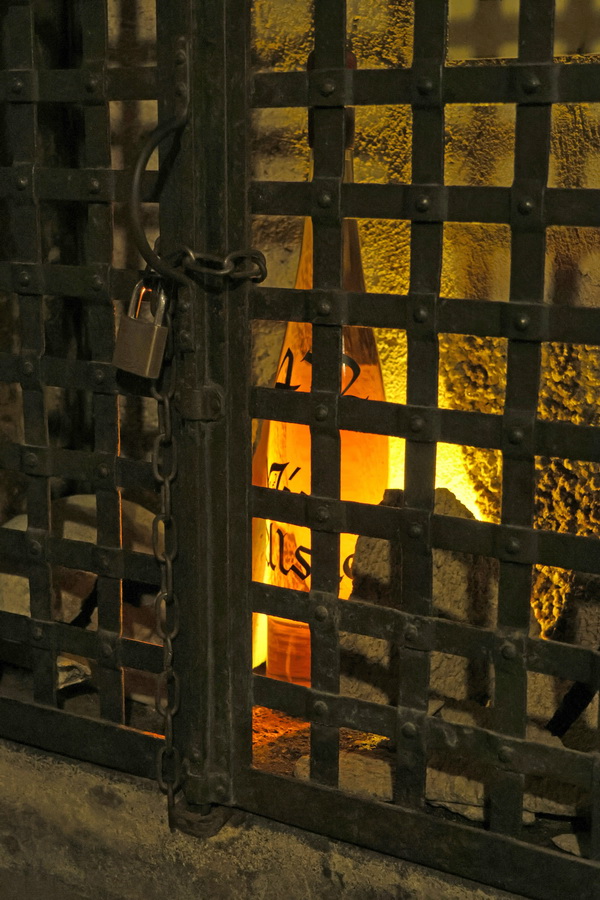 Au fond d’une galerie de foudres alignés, une grille protège une légende.