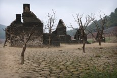 - Ruines au fond du lac de Guerlédan asséché en 2015 (Bretagne).