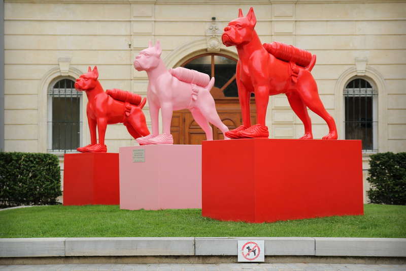 - Chien interdit sur la pelouse. Œuvre de William Sweetlove (« Cloned bulldog with pet bottle »), sur la place E. Loubet, à Montélimar (Drôme).