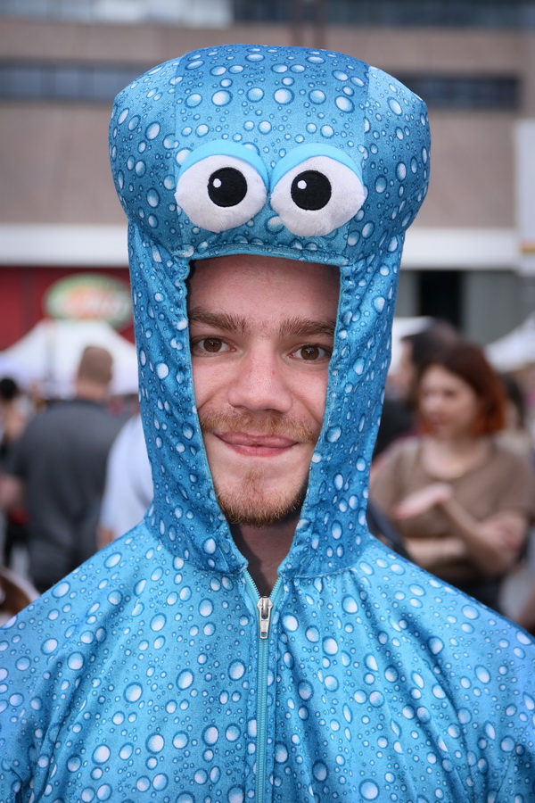 Ma préférée, c’est le gars qui traverse la rue dans son « costume » grotesque. 😀