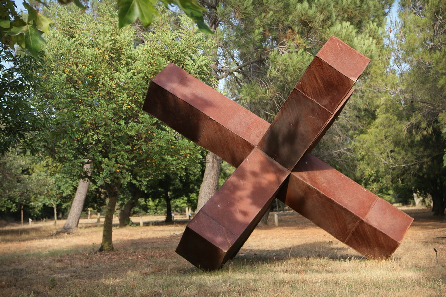« Mégalo X », de David Vanorbeek, exposé dans l’arboretum des Mas du Roussillon (Canet-en-Roussillon, Pyrénées-Orientales). Métal recyclé, soudé, 350x350x350 cm.