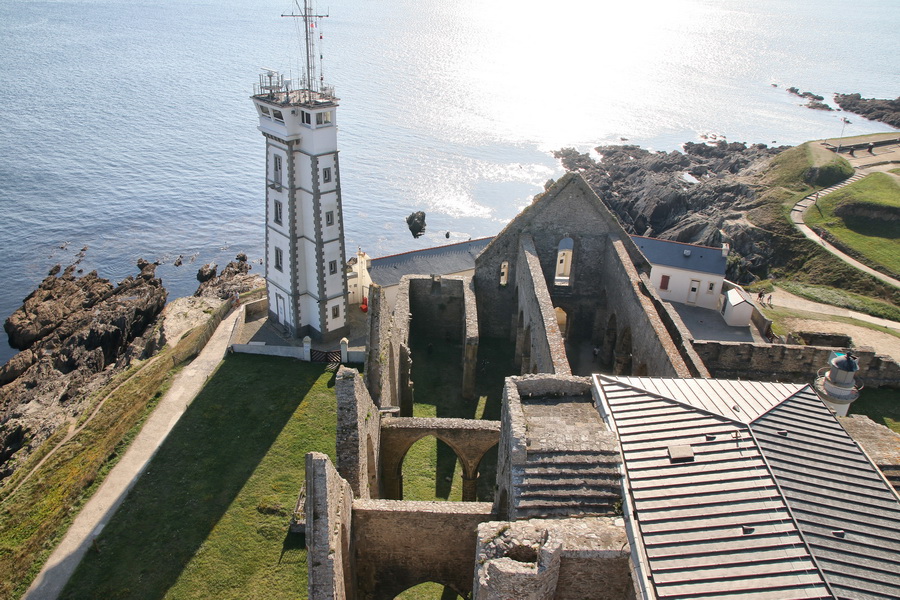 Vue sur les ruines de l’Abbaye de Fineterre en Saint-Mathieu et le sémaphore depuis le phare de la Pointe Saint-Mathieu, à Plougonvelin (Finistère, Bretagne).