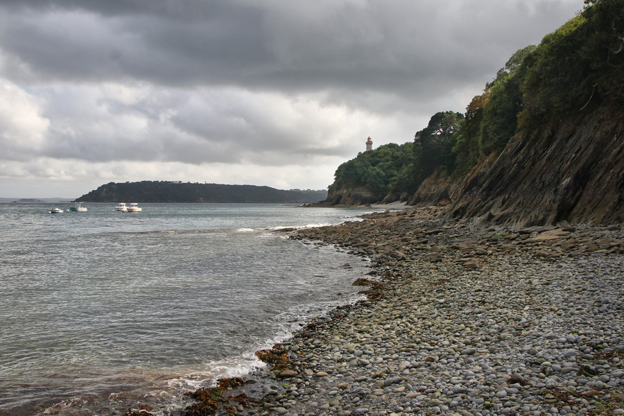 Le phare du Portzic et la presqu’île de Crozon vus depuis le village de pêcheurs de Maison-Blanche (Brest, Finistère, Bretagne).